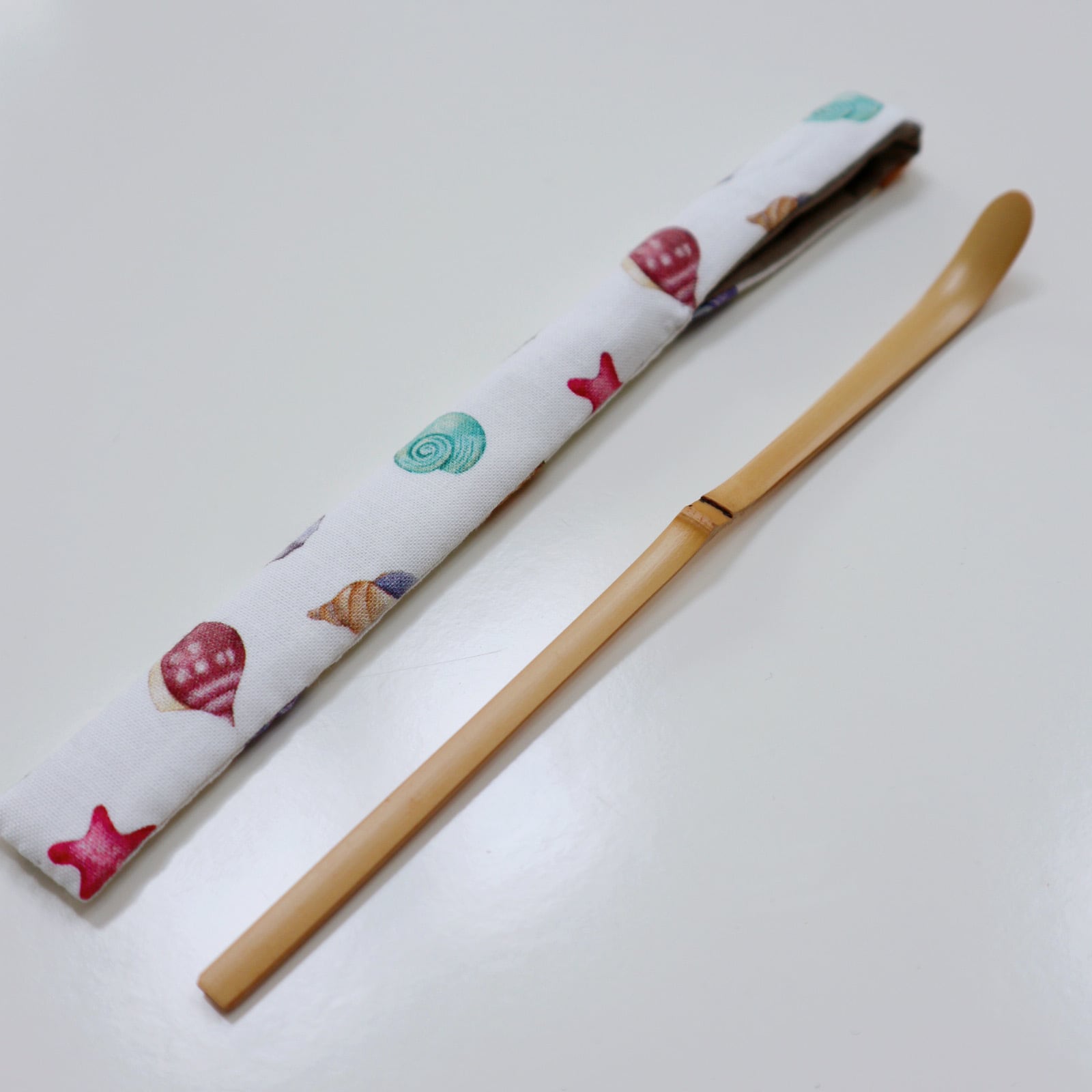 茶杓入れを可愛く収納できる茶箱用の茶杓入れが登場しました。夏向きの貝殻や珊瑚の絵柄が施された教室オリジナルのアイテムは、限定の希少価値があります。長さ約19cmは茶籠にもぴったりフィット。17.5㎝の茶杓がピッタリ収まるので、使い勝手も抜群です。
