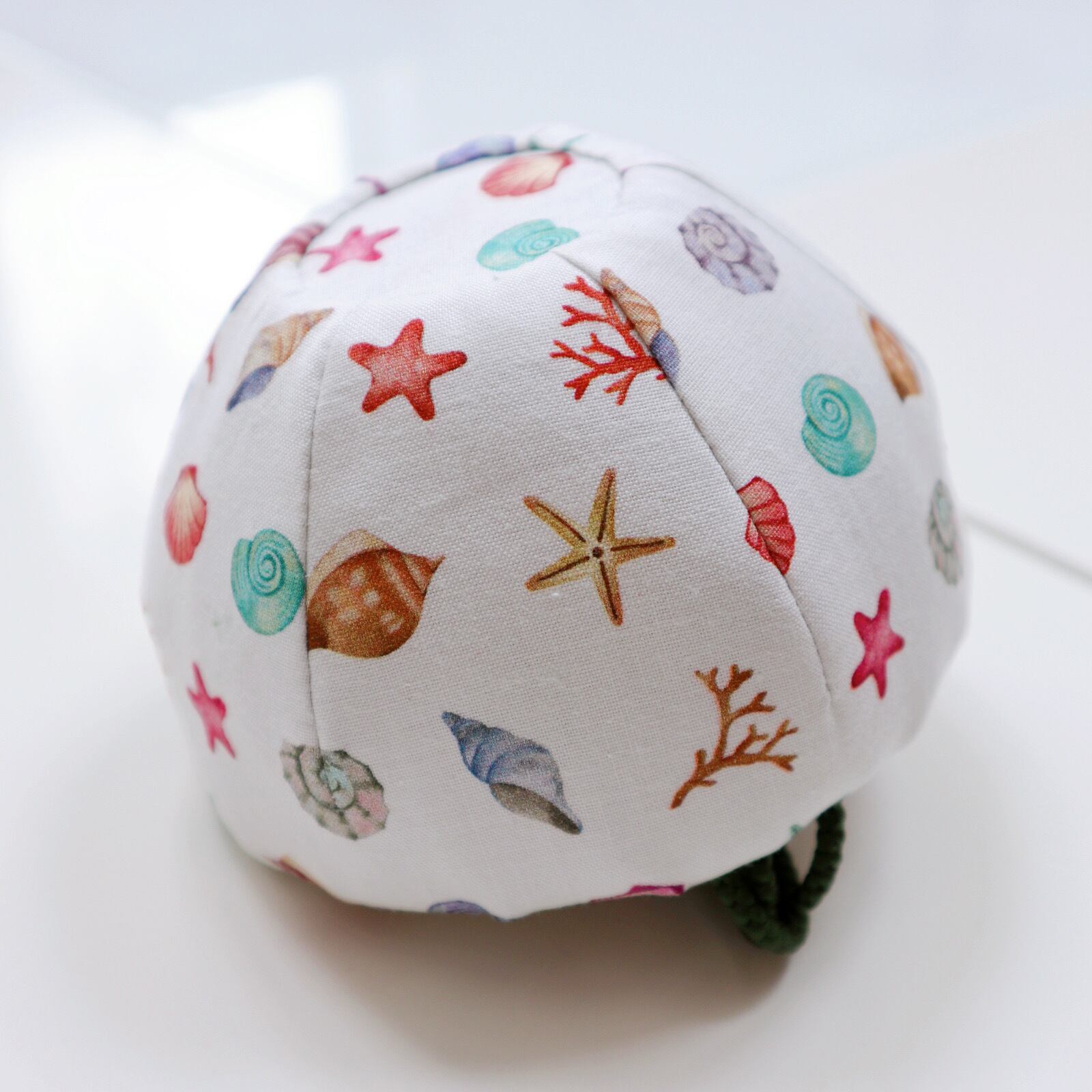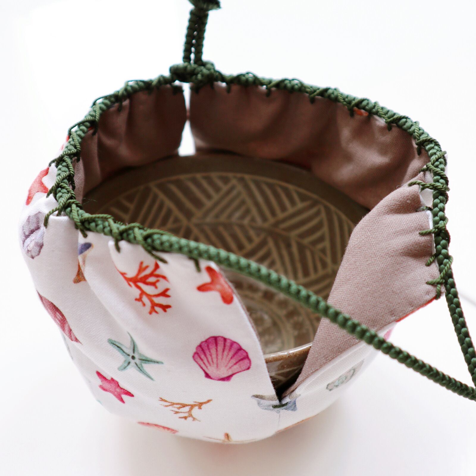 教室オリジナルの1点限定茶箱用茶碗の仕覆です。茶籠や茶箱にピッタリなサイズで、夏向きの貝殻や珊瑚の柄が施されています。直径約11㎝、高さ約7㎝位の小さめのお茶碗に合うサイズなので、スッキリ収納できます。テーブルを彩るアクセントにぴったりのアイテムです。